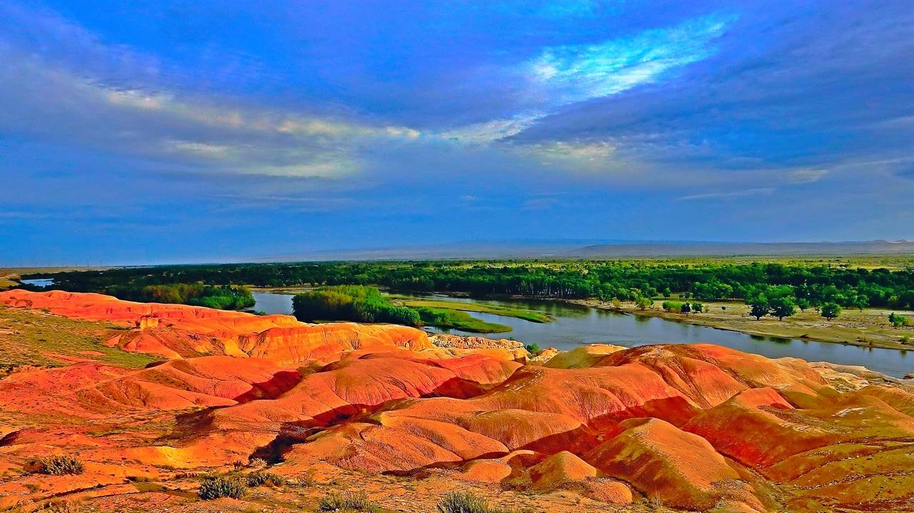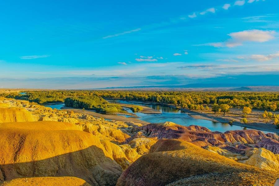 它毗鄰碧波蕩漾的額爾齊斯河,與對岸蔥郁青翠的河谷風(fēng)光遙相輝映,可謂“一河隔兩岸,自有兩重天”。激猛的河流沖擊以及狂風(fēng)侵蝕,形成了北岸的懸崖式雅丹地貌,河岸巖層抗風(fēng)化能力強弱不一,輪廓便會參差不齊,而巖石含有礦物質(zhì)的不同,又幻化出種種異彩,因此得名“五彩灘”。而南岸卻是綠樹葳蕤,連綿成林,遠(yuǎn)處逶迤的山巒與戈壁風(fēng)光盡收眼底。
