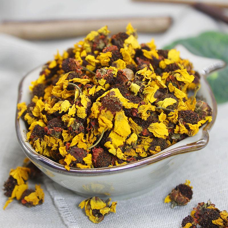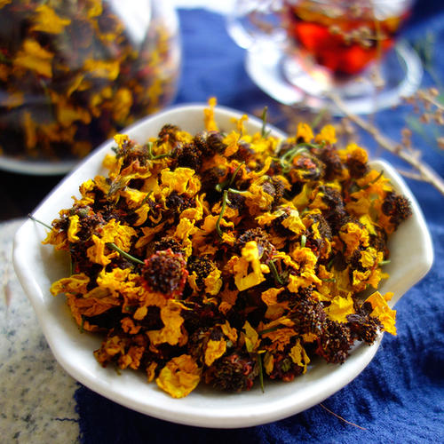 雪菊,學(xué)名兩色金雞菊(Coreopsis tinctoria)、蛇目菊,為菊科金雞菊屬(Coreopsis)多年生草本植物,在我國新疆尤其是和田地區(qū)、云南部分地區(qū)有一定規(guī)模栽培。因其能夠生長在海拔3000m以上的新疆昆侖山積雪高山區(qū)域而得名“雪菊”。由于湯色紅,亦名血菊。