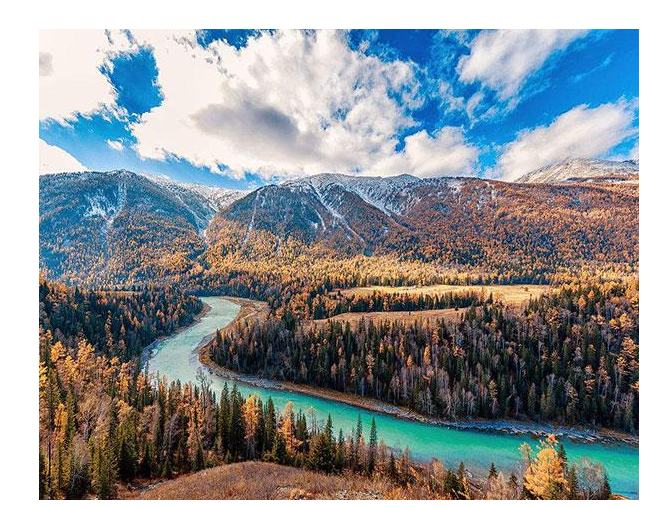 喀納斯湖水變換著各種美妙的顏色,寶石般的湖藍色,亦或是金黃色、淡綠色、銀白色、橙紅色,什么顏色照到了這面鏡子里,它就變化成什么顏色。秋天的色彩更是豐富,白樺林銀白的樹干、金黃的葉子,其中夾雜著翠綠的松柏,天空是湛藍湛藍的。
