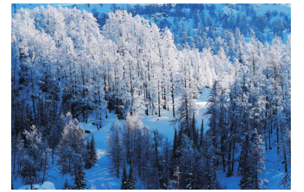 冬日禾木展現(xiàn)出另一番美景,豎線條的樹干讓畫面看上去更加整齊、規(guī)整,而即使都是白色的雪,之間也因為光影的不同而具有色彩、明暗的變化。