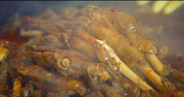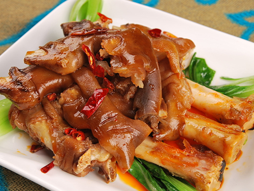 3、羊蹄入老湯鍋燉爛(指蹄筋)后入盤,把羊蹄鹵到熟爛,羊蹄本身沒(méi)有什么肉,就是一層皮,要小心不要過(guò)爛,導(dǎo)致骨肉分離的悲慘下場(chǎng)。鹵好后,撈出,用胡椒、辣面等佐料拌勻即可,或者可以淋一些剛才的鹵湯汁。